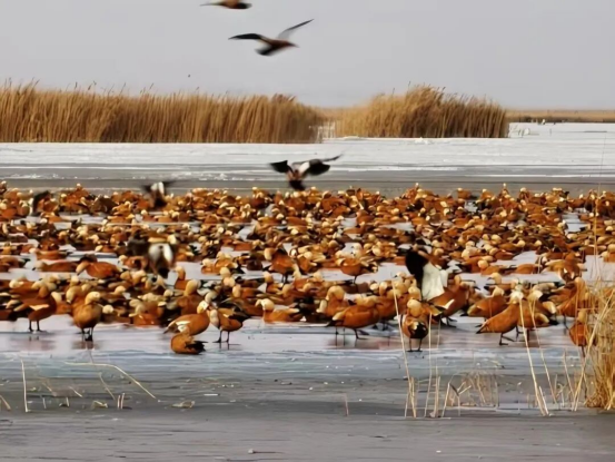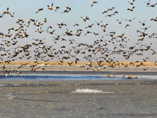 其中,赤麻鸭种群表现尤为突出,数量庞大,成为本次调查中的优势物种。具体监测数据显示:乌毛计调查点监测到赤麻鸭种群数量达12,000只,坝湾调查点监测到赤麻鸭数量约2,000只,沙尖子调查点监测到赤麻鸭数量约2,000只。仅以上三个调查点记录的赤麻鸭总数已近2万只,充分表明了乌梁素海湿地是赤麻鸭等越冬水鸟的关键栖息地,其丰富的食物资源和相对适宜的越冬环境吸引了大量水鸟聚集。此次同步调查的成功开展,不仅精准获取了当前越冬水鸟种群动态的一手资料,也体现了跨部门协作在生态监测与保护中的重要作用。乌梁素海湿地保护区管理局将持续加强与科研院所的合作,深入开展长期监测,密切关注候鸟种群变化,并以此为依据,进一步优化湿地保护管理措施,切实维护区域生态平衡与生物多样性安全,筑牢我国北方重要的生态安全屏障。
