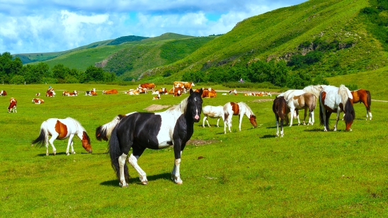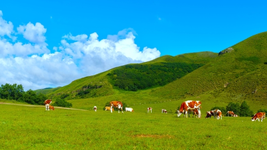 8月10日,阿鲁科尔沁旗最北部的巴彦温都尔苏木塔林花国家自然公园游牧场的河谷地带,牲畜正在觅食。(李富 端木 摄)