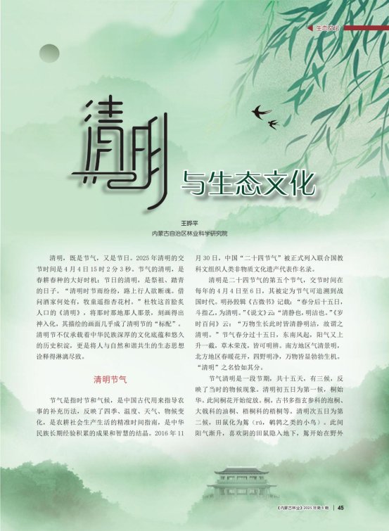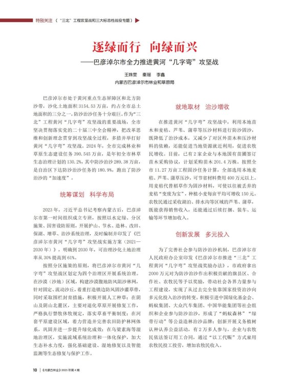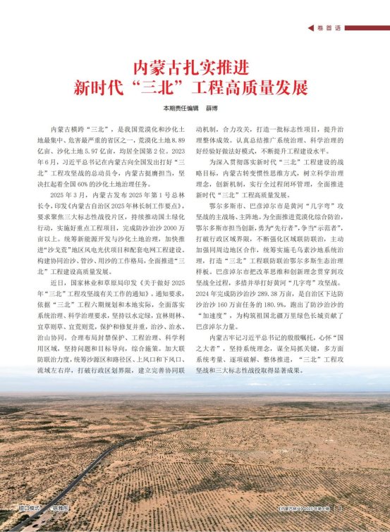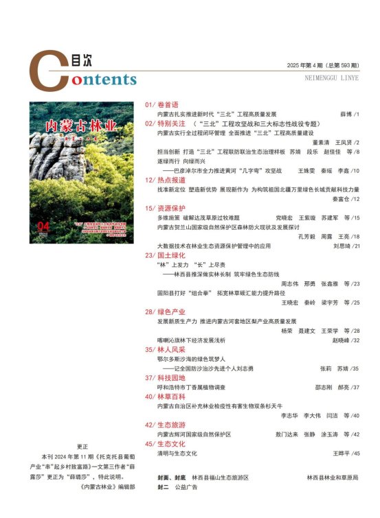 2025年3月,内蒙古发布2025年第1号总林长令,印发《内蒙古自治区2025年林长制工作要点》;国家林业和草原局印发《关于做好2025年“三北”工程攻坚战有关工作的通知》。为深入贯彻落实新时代“三北”工程建设的战略目标,《内蒙古林业》2025年第4期《特别关注》栏目特设“‘三北’工程攻坚战和三大标志性战役”专题,对内蒙古转变惯性思维方式,树立科学治理理念,创新机制,实行“三北”工程全过程闭环管理的高质量管理模式;鄂尔多斯市打破行政区域界限,打造“三北”工程联防联治生态治理样板;巴彦淖尔市以水定绿、分区施策、系统治理多措并举打好黄河“几字弯”攻坚战,全面推进新时代“三北”工程高质量发展进行了报道。《热点报道》栏目聚焦林草科研单位的科技支撑作用,提出2025年重点林草科技发展的布局和部署。同时,其他栏目针对草原过牧问题、林长制的落实、碳汇能力提升、绿色产业发展等备受关注的内容,从不同侧面给出了基层林草事业发展的多维策略和路径。