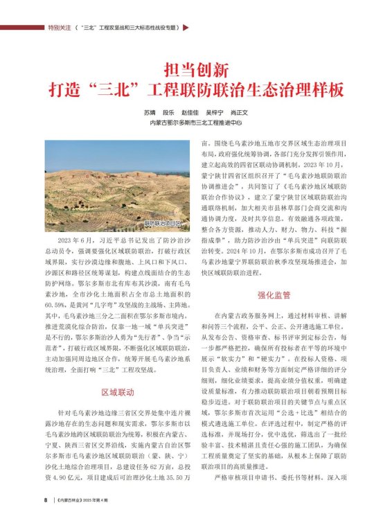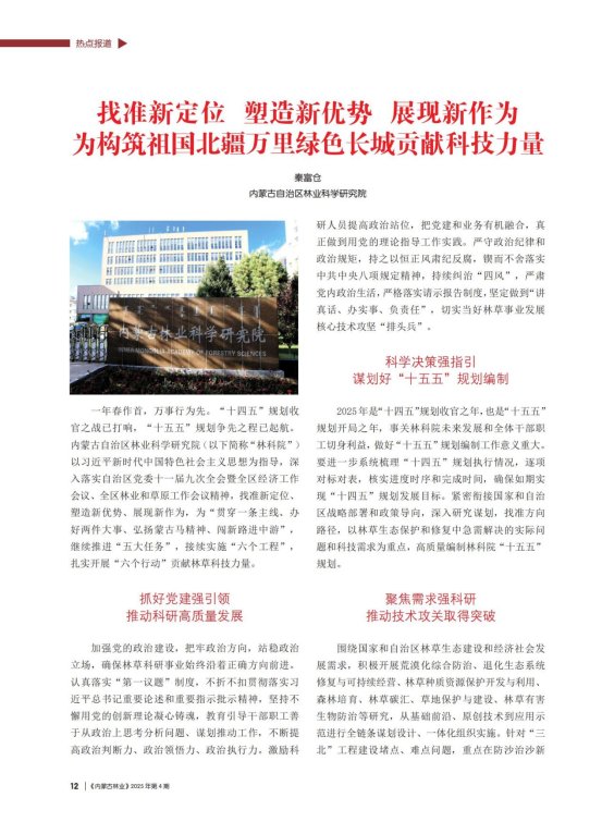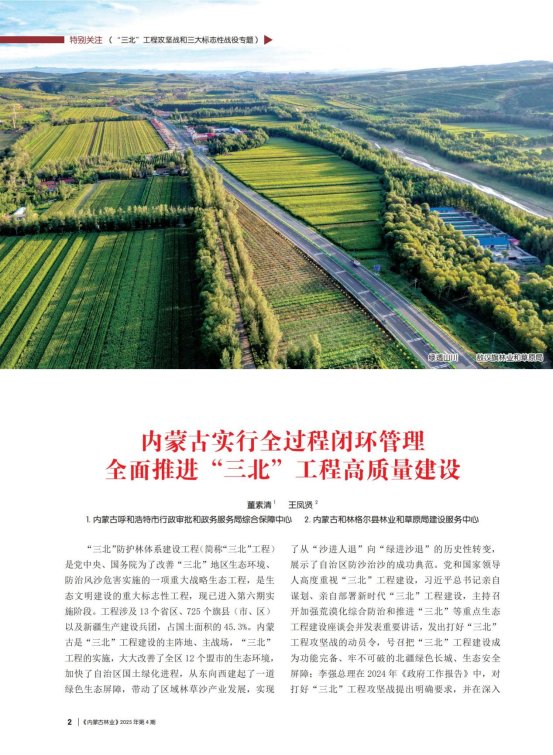 《内蒙古林业》2025年第4期推进“三北”工程高质量发展, 2025年3月,内蒙古发布2025年第1号总林长令,印发《内蒙古自治区2025年林长制工作要点》;国家林业和草原局印发《关于做好2025年“三北”工程攻坚战有关工作的通知》。为深入贯彻落实新时代“三北”工程建设的战略目标,《内蒙古林业》2025年第4期《特别关注》栏目特设“‘三北’工程攻坚战和三大标志性战役”专题,对内蒙古转变惯性思维方式,树立科学治理理念,创新机制,实行“三北”工程全过程闭环管理的高质量管理模式;鄂尔多斯市打破行政区域界限,打造“三北”工程联防联治生态治理样板;巴彦淖尔市以水定绿、分区施策、系统治理多措并举打好黄河“几字弯”攻坚战,全面推进新时代“三北”工程高质量发展进行了报道。《热点报道》栏目聚焦林草科研单位的科技支撑作用,提出2025年重点林草科技发展的布局和部署。同时,其他栏目针对草原过牧问题、林长制的落实、碳汇能力提升、绿色产业发展等备受关注的内容,从不同侧面给出了基层林草事业发展的多维策略和路径。