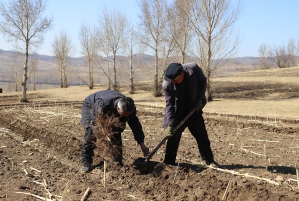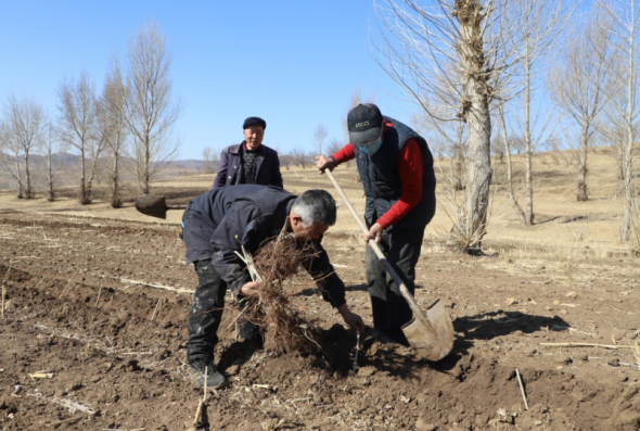 在突泉镇建国村的一处林粮间种地块,村民正在补栽树苗,他们分工明确,有的挖坑,有的扶树,有的填土,配合默契,严格按照树木种植的规范要求进行操作,确保每一棵补种的树木都能茁壮成长。